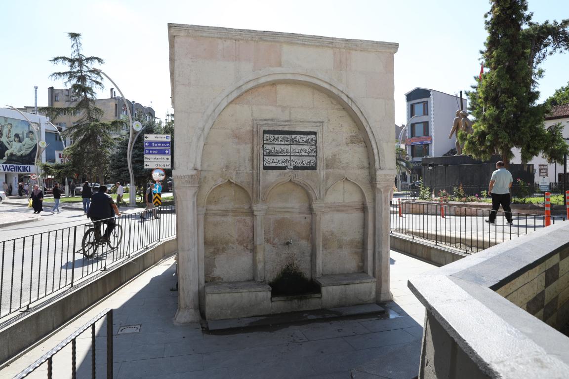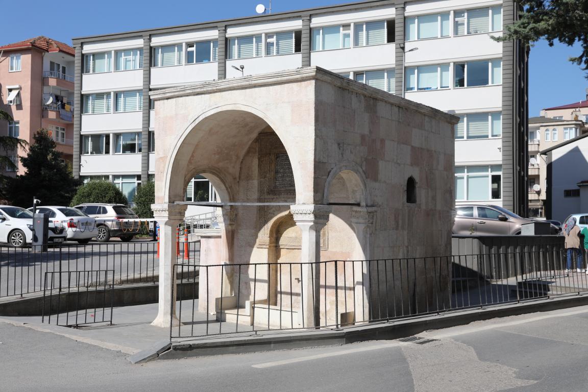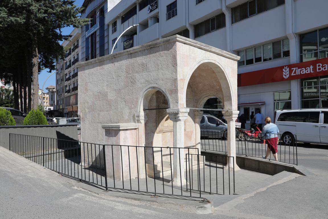 Cumhuriyet Mahallesi'nde 39 ada, 6 parselde yer alan çeşme Geç Osmanlı Dönemine ait olup bir meydan çeşmesidir. Cadde üzerinde bulunan yapı düzgün kesme taştan yapılmıştır. Ön cephesi önde iki sütun, arkada iki yarım sütunla taşınan yuvarlak kemerlidir. Sütun başlıkları zikzak motiflerle süslüdür. Duvarda işlemeli bir çerçeve içinde 8 satırlık bir kitabe olup ortadan dikine çizgiyle ikiye ayrılmıştır. Ortadaki kemerin üzerinde dikine bir çizgi ile ikiye ayrılan 3 satırlık bir kitabe yer almaktadır. Çeşmenin üst kısmı düzdür. 08.03.1984'te tarihi olarak tescillenmiştir.
